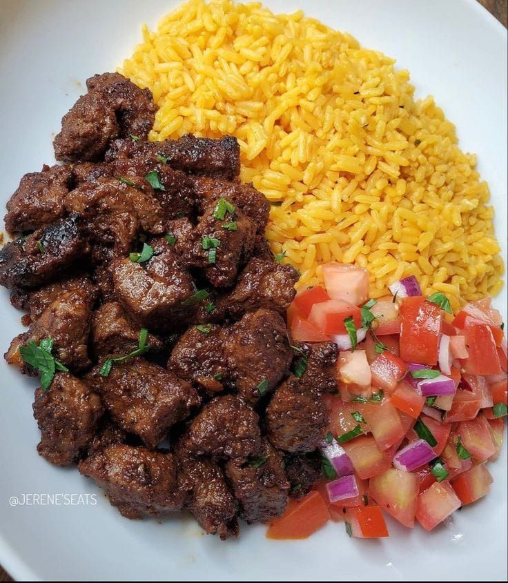 Serve the spiced beef with yellow rice and a side of fresh tomato salad.